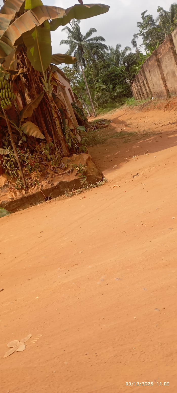 This image depicts a rural or semi-urban street scene in Abagana, Nigeria, captured on 03/12/2025 at 11:00. The foreground features an unpaved reddish-brown dirt road, showing light tire track impressions. On the immediate left, a large banana plant with green fruit clusters stands beside the road. Below the banana plant, a shallow, concrete-lined ditch runs parallel to the road, partially obscured by low-growing green vegetation. Behind the banana plant and vegetation, a portion of an unpainted concrete block structure or building is visible. Along the right side of the dirt road, a weathered concrete block wall extends into the midground. The background consists of dense green foliage, including several tall palm trees and other tropical vegetation, with at least one utility pole discernable amidst the trees. The sky is overcast. No individuals or animals are present. A light-colored, irregularly shaped object, possibly paper or plastic, lies on the dirt road in the lower-left foreground.