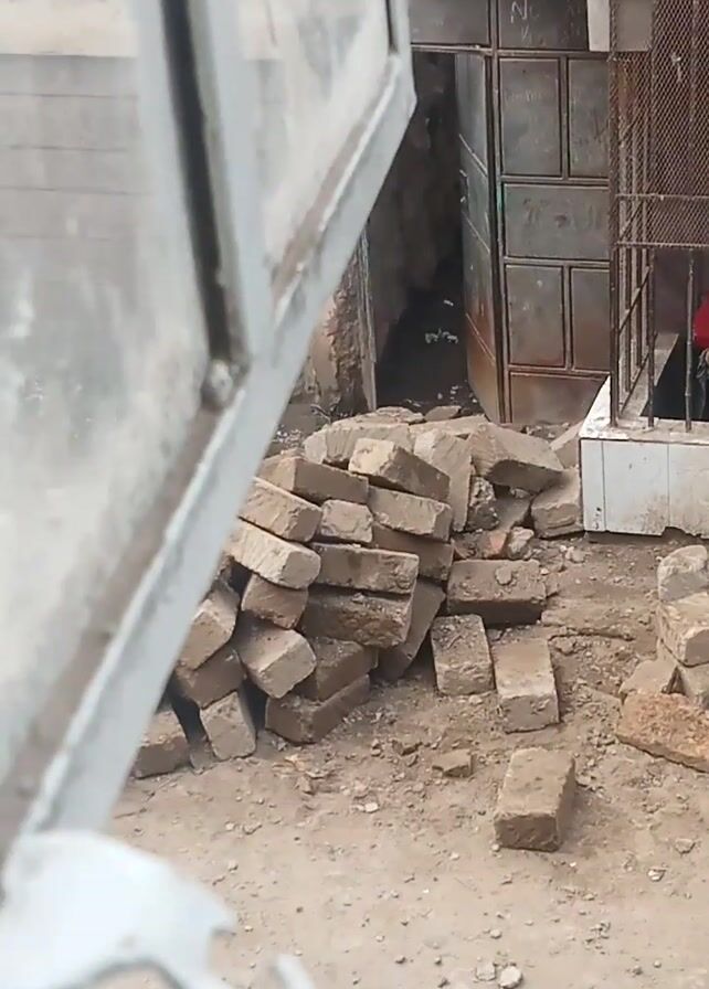 From a high vantage point, the video shows a person in a red shirt and black shorts stepping over a pile of beige bricks, partially obscured by a window frame. The ground is dirt-covered. In the background is a dark, cage-like structure.