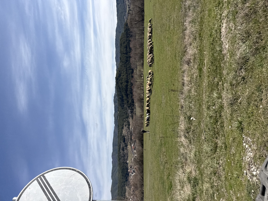 An outdoor, wide-angle shot captures a rural landscape near Kraishte, Bulgaria, under a bright blue sky with sparse, high-altitude clouds. The foreground consists of an uneven, dry grassy embankment, transitioning into a large, flat green pasture that occupies the midground. To the left, partially cropped, stands a circular white traffic sign with two parallel black diagonal lines angled from the upper left to the lower right, indicating the end of all local prohibitions. In the center-left midground of the pasture, a single individual, dressed in dark clothing, stands facing right, observing a large flock of approximately 60-80 sheep. The sheep, predominantly light-colored with some darker individuals, are dispersed across the green field, appearing to graze. Beyond the pasture, a line of dormant deciduous trees with bare branches forms a natural border, behind which structures of a small village or town are visible, including buildings with light-colored walls and red-tiled roofs. In the background, densely forested hills covered with coniferous trees rise, culminating in a distant, higher mountain range. The scene is illuminated by direct sunlight, casting minimal shadows, consistent with a clear day.