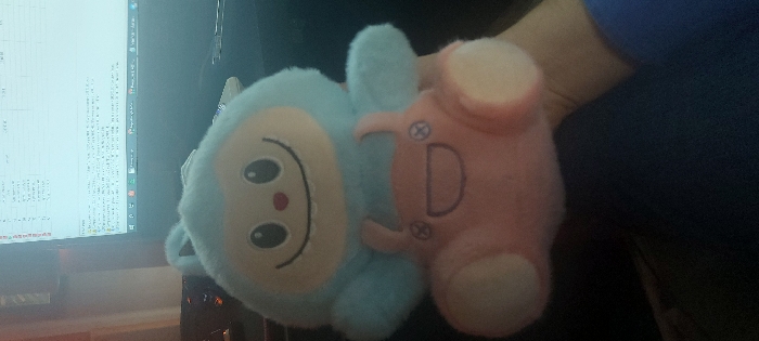 A light blue plush toy with a pale yellow face, black oval eyes, a red nose, and a wide black smile, wearing light pink overalls with two circular embroidered details and a darker pink smile, is centrally held by a human hand. The hand exhibits fair skin, and a blue fabric sleeve is visible on the wrist. In the upper background, a brightly illuminated computer monitor displays rows and columns of data, resembling a spreadsheet, and a taskbar with various application icons. The environment is an indoor room, likely a personal workspace with a desk, located in Tashkent, Uzbekistan.