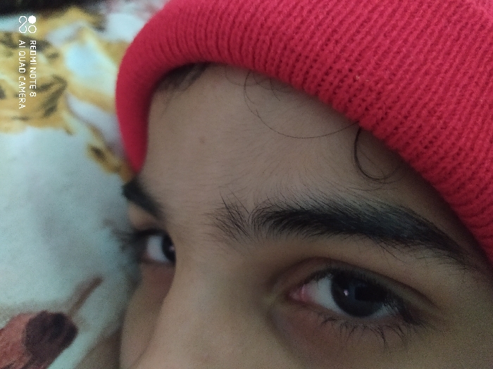 A close-up captures a person's face from the eyebrows to the cheekbones, primarily focusing on the eyes. One eye is looking directly at the camera, while the other is slightly turned. Prominent eyebrows sit above each eye. A red beanie is positioned on the person's head, with a few strands of hair escaping beneath it. The skin tone appears fair. Part of a floral-patterned fabric is visible near the left side of the frame, close to the face. A camera watermark is present at the upper left corner of the picture.