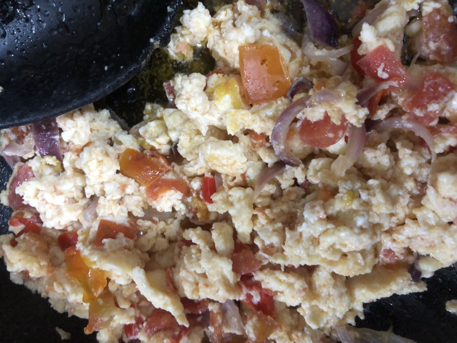 Scrambled eggs are mixed with diced red and yellow tomatoes and thin slices of red onion
