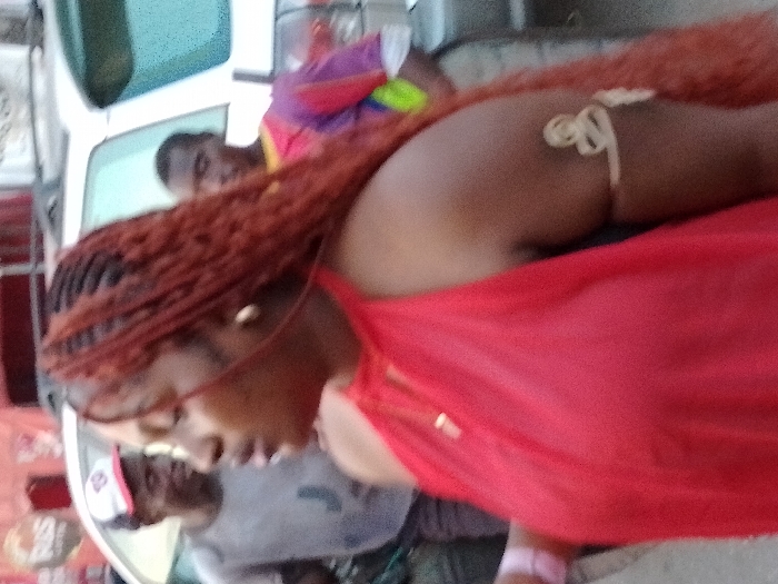 A woman with braided reddish hair wears a red dress. The dress exposes part of her upper back and shoulder. Another individual is partially visible behind her near the top of a vehicle. The image is rotated counter-clockwise. Another person can be seen near the bottom left of the image wearing a hat. The scene appears to be outdoors.