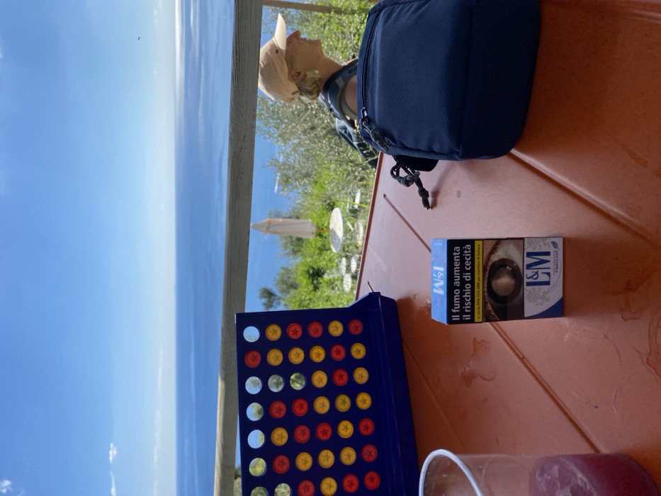 The image captures an outdoor scene in Corniglia, Italy, under a clear blue sky with minimal cloud cover, overlooking the Mediterranean Sea. In the immediate foreground, an orange-brown outdoor table displays several items. On the far left, a clear plastic cup contains a reddish-purple liquid with ice. To its right, a blue "Connect Four" game board stands upright, populated with red and yellow tokens. Centrally located is a blue and white pack of L&M cigarettes, oriented vertically, featuring the Italian health warning "IL FUMO AUMENTA IL RISCHIO DI CECITA'" (Smoking increases the risk of blindness) and an image of an eye. To the right of the cigarette pack, a small, dark blue zippered bag with a braided cord handle rests on the table. Water rings are visible on the table surface. To the right, partially visible from the chest up and in profile, is an adult individual with light-colored hair, wearing a beige baseball cap and a dark top, facing right and looking out towards the sea. A visible earring adorns their ear. Behind the table, a horizontal wooden railing separates the foreground from the distant view. Beyond the railing, a green, terraced hillside populated with olive trees descends towards the coastline. White outdoor tables and umbrellas are visible on the hillside, suggesting a seating area. The expansive, deep blue Mediterranean Sea stretches to the horizon, reflecting sunlight on its surface.