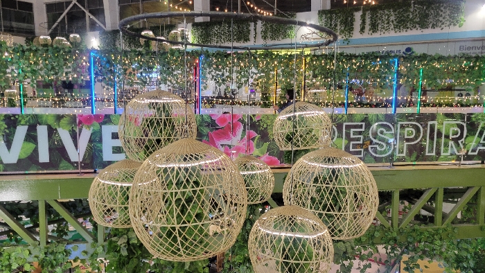 A vibrant indoor display features interwoven, spherical light fixtures suspended from a circular structure. Lush greenery adorns the background, with a banner reading "VIVE RESPIRA" punctuated by floral accents. String lights and colored vertical lights enhance the ambiance. A sign bearing the words "REY SOLIS" is also visible in the background. The overall impression is a blend of nature and urban design.