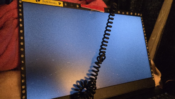 The image displays a close-up, low-angle perspective of an electronic display, likely a laptop or monitor screen, in an indoor setting within Lompoc, United States. The screen exhibits a uniform blue background covered with numerous fine, white specks. A black, coiled cable is positioned diagonally across the screen, extending from the upper right to the lower left, casting a distinct shadow on the display surface. The top bezel of the screen is adorned with a strip of dark material featuring a series of small, light-colored circular markings. A yellow label or sticker is partially visible on this strip, displaying the word "Buttcheeks" flanked by small heart symbols. To the left of the screen, a crumpled mass of red fabric is present. The environment is dimly lit, with warm, orange-toned light reflecting off the lower area of the screen and the coiled cable. No individuals are depicted.