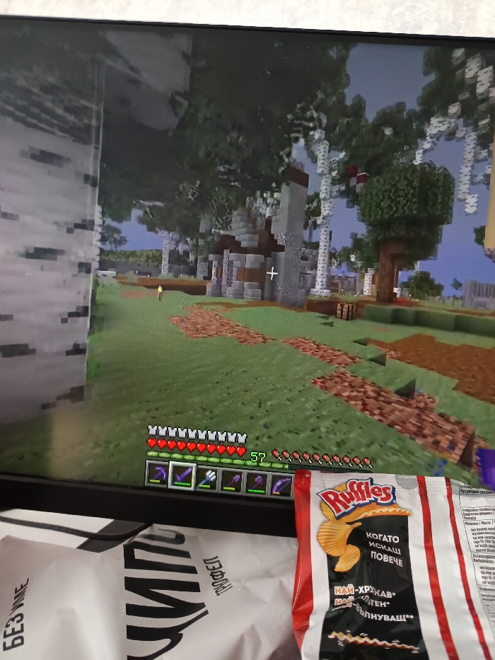 An overhead image displays a monitor screen positioned on a dark, flat surface in the city of Kazichene, Bulgaria. The monitor renders a scene from the video game Minecraft, depicting a blocky, grassy landscape with dirt pathways, numerous birch trees, and stone structures resembling buildings or ruins. A single lit torch stands on the ground in the mid-left of the virtual environment. A white crosshair is centered on the screen. The game's user interface is visible at the bottom, showing full health (20 hearts) and armor (10 points), an experience level of 57, and a hotbar containing various tools including a purple pickaxe, a purple sword, iron tools, and a bow. In the foreground, resting on the dark surface in front of the monitor, are two bags of chips. The bag on the right is a red, white, and black Ruffles brand bag, featuring Bulgarian text translating to "When you want more" and "Crispiest, most flavorful." The bag on the left is largely white with black lettering, partially obscured, with visible Bulgarian text "No name" and "Trophies." No individuals are present in the image.