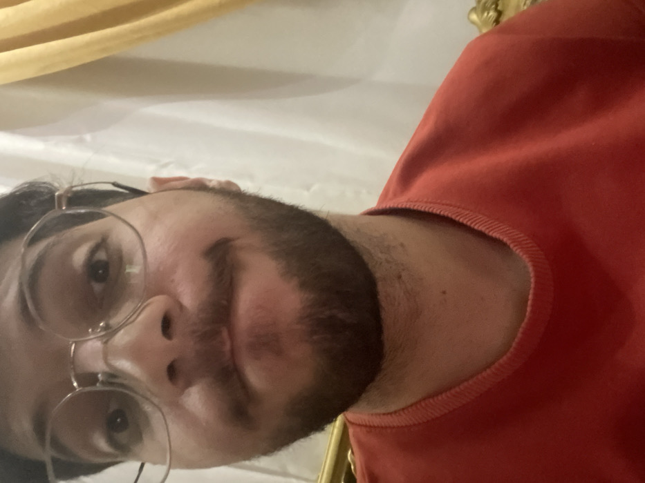 - "A close-up, front-facing portrait depicts a male individual with dark hair, a beard, and a mustache, wearing round-frame eyeglasses and a plain red crew-neck shirt" by FM-jBMJn1, licensed under CC BY 4.0