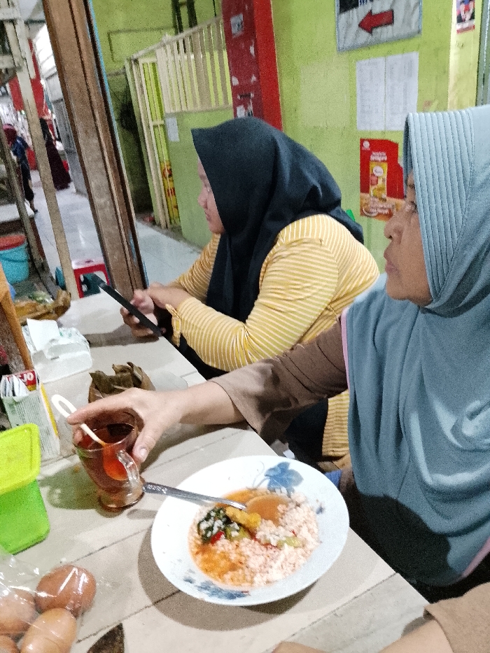 Two women wearing hijabs sit at a table. One woman wears a yellow striped shirt and a black hijab and looks at a cell phone. The other woman wears a gray-blue hijab. A plate of food sits on the table with a spoon. A cup of tea and a container of eggs are also on the table. A red arrow points left on a sign in the background.