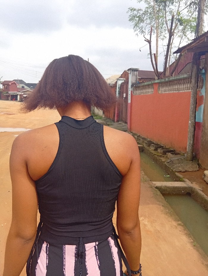 The image captures an individual walking away from the camera on an unpaved road in a residential area of Aba, Nigeria, under an overcast sky. The subject, viewed from the rear, has dark, coarse-textured hair styled in a short bob or flared Afro. They are wearing a black, ribbed, high-neck sleeveless top and a lower garment featuring vertical black and pinkish-white stripes. A thin gold chain is visible on the neck, and a dark bracelet is present on the left wrist. To the immediate right of the subject, an terracotta-orange colored wall extends parallel to the dirt road, topped with a decorative concrete fence element. An open drainage channel filled with murky water runs alongside the wall, separating it from the unpaved path. Behind the wall, corrugated metal rooftops and portions of buildings are visible, along with trees displaying trimmed branches. To the left, the unpaved road extends into the background, where multiple residential structures with varied rooflines are observed. Overhead utility lines are faintly visible against the cloudy sky. The ground surface is composed of reddish-brown dirt or mud.