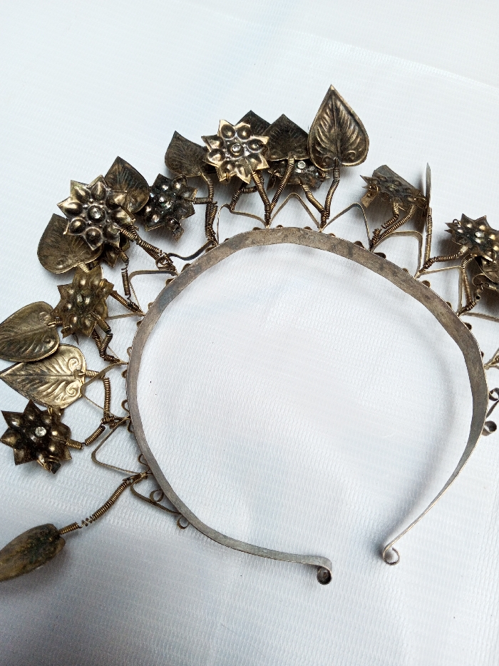 An ornate, U-shaped metal headpiece, consistent with a tiara or crown, is depicted against a white, subtly textured surface. The primary structure consists of a silver-toned metal band, approximately 1 cm in width, which forms an open curve. The ends of this band curl inward into small scrolls. Extending upwards from the band are numerous decorative elements crafted from brass-toned metal. These decorations include stylized leaves and multi-petaled flowers, some of which feature small, clear, faceted stones embedded in their centers. The individual elements are interconnected and attached to the main band by intricate wirework, also brass-toned, forming a dense, vine-like pattern. One elongated, possibly stone or metal, drop-shaped pendant hangs from the lower left side of the arrangement. Both the silver-toned band and the brass-toned decorative components exhibit areas of tarnishing and oxidation, indicative of age or wear. The object is positioned at an angle, with its opening facing towards the bottom center of the frame. The scene is located in Qarabucaq qəsəbə, Azerbaijan.