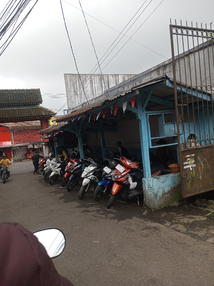 The image displays a street scene in Ciherang, Indonesia, observed from the perspective of a motorcycle, with a brown garment and the right-side mirror visible in the lower-left foreground. To the right, a light blue, open-sided wooden structure with a corrugated metal roof is decorated with red and white triangular flags along its eaves. Approximately ten motorcycles, mostly scooters in various colors including orange, white, black, and blue, are parked beneath this shelter. At least two individuals are partially visible within the shelter, one behind the parked vehicles and another seated further back. A rusty, brown metal gate, partially open, adjoins the right side of the structure, featuring faded white text and an orange bucket near its base. An asphalt road occupies the midground. A person in a yellow shirt rides a motorcycle away from the viewer, towards the left. Another individual in a dark shirt walks on the asphalt, adjacent to the parked motorcycles, also moving leftward. In the background on the left, a red building with a dark, multi-tiered traditional Indonesian roof structure is prominent, displaying a partially visible yellow sign and a red sign with white text on its facade. The sky is overcast and gray. Numerous black electrical or communication wires crisscross the upper portion of the frame.