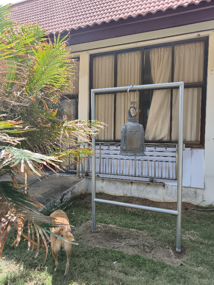 A metal bell hangs from a frame in front of a building with curtained windows and a red-tiled roof. A small, light brown dog stands in the foreground, partially obscured by green foliage. The dog faces away from the viewer, its tail slightly visible. The area around the bell stand is grassy, with a concrete path leading to the building in the background.