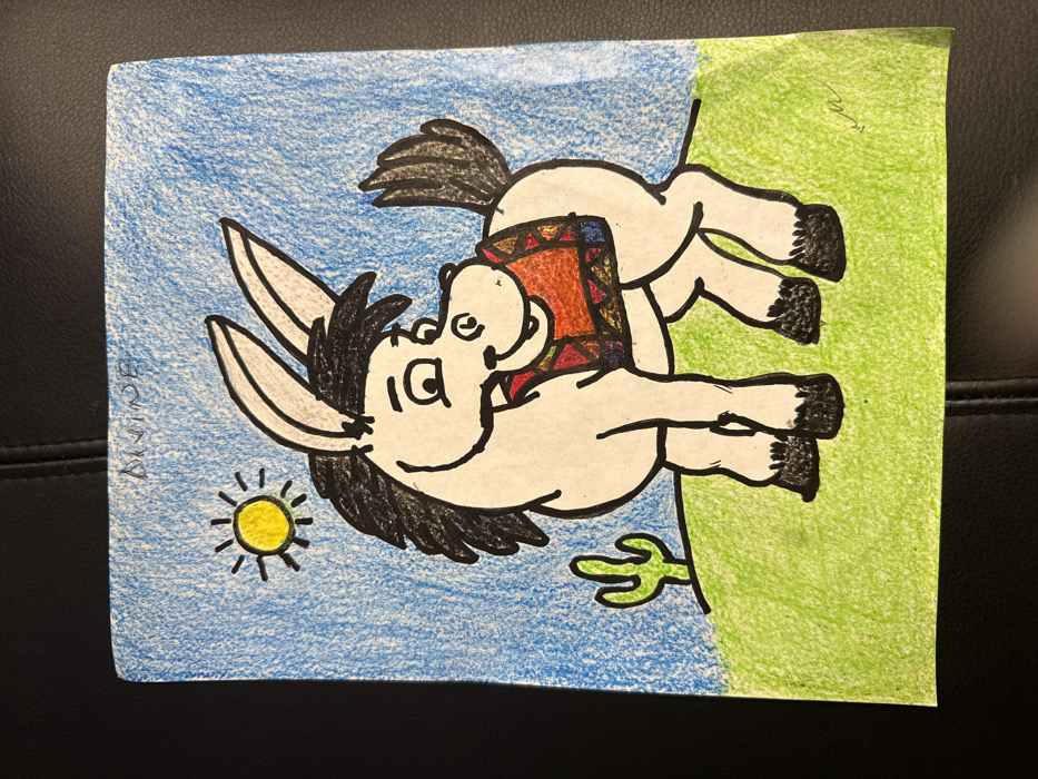 A hand-colored drawing on white paper depicts a cartoon donkey in a stylized desert environment