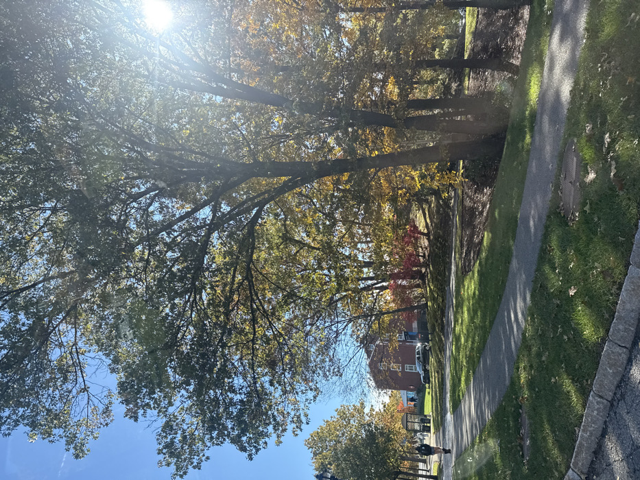 The image displays an outdoor scene in Waltham, United States, under clear, sunny daytime conditions. A paved sidewalk curves from the lower-left foreground towards the mid-left distance. A single individual, dressed in dark clothing, walks away from the camera on this sidewalk. To the left of the sidewalk, a dark streetlamp post and a semi-transparent bus stop shelter are visible. In the mid-ground background, a multi-story reddish-brown building with visible windows stands, adjacent to a partial blue structure and two parked vehicles (one dark, one light-colored). The majority of the scene is dominated by numerous deciduous trees exhibiting autumn foliage in shades of green, yellow, orange, and distinct red on a gentle incline to the right. The foreground features mown green grass with scattered fallen leaves and a visible manhole cover. A dark granite curb borders the grass in the lower left, indicating the edge of a road. Strong sunlight emanating from the upper right creates a prominent lens flare and casts elongated shadows across the ground.