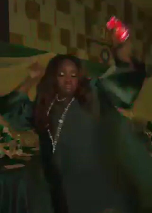 A woman with long dark hair is dancing in a room with flashing red and green lights. She is wearing a dark green dress or robe and a silver necklace. She is holding a blue object in her right hand and raising both arms. There are tables set for dining in the background. The walls are decorated with a geometric pattern.