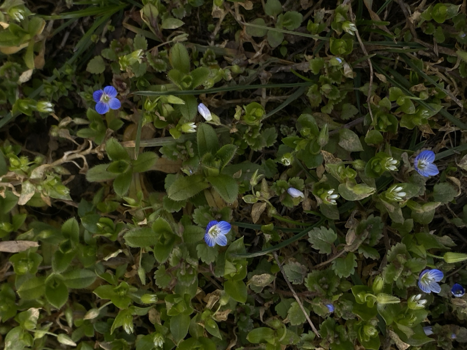 The image displays a close-up, top-down view of ground-level vegetation located in Dobri dial, Bulgaria. The scene is dominated by a dense cluster of small plants, primarily identified as *Veronica persica* (Persian speedwell). Several small, four-petaled flowers are visible, exhibiting a vibrant blue color with white centers and darker blue venation. Some flowers are fully open, while others appear as buds or are partially closed. The plants feature numerous green leaves, which are generally small, rounded, and arranged in a low-growing mat. Patches of dried, light-brown plant material and visible dark soil are interspersed among the green foliage. No individuals, animals, or man-made objects are present within the frame. The lighting suggests an outdoor, natural environment.