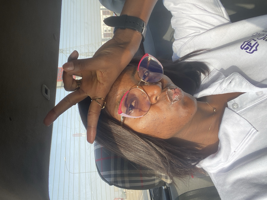 A woman poses in a car. She's wearing a white polo shirt with a logo. The woman also has glasses and two rings. Her hand is raised, forming a "W" or "West Side" gesture. The background shows the interior of the car, including a seat and door panel, along with a blurred view of a cityscape visible through the car window.