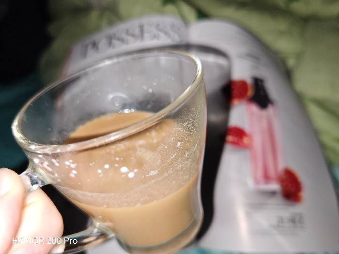 A close-up indoor shot captures a clear glass mug, approximately two-thirds full with a light brown beverage, likely coffee or tea with milk. White residue or foam remnants are visible on the inner surface of the mug above the liquid line. A person's thumb and fingers are grasping the handle of the mug on the lower right side of the frame. In the blurred background, an open magazine or catalog is discernible. The left page displays the partially visible word "POSSESS," while the right page features a blurred image of a vertical pink object, possibly a garment or container, alongside several indistinct red shapes. The magazine rests on a light green fabric surface. The scene is situated in Haskovo, Bulgaria. The image carries a "HONOR 200 Pro" watermark in the lower left corner.