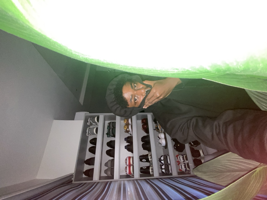The scene is an indoor, self-taken portrait set in Igboefon, Nigeria. An adult individual with dark skin and dark, curly hair is positioned slightly right of center, looking directly into the camera. The individual wears a dark, hooded garment with the hood up, and their right hand is placed over their mouth and chin area. Their left arm extends towards the camera. To the left of the individual is a light-colored, multi-shelf shoe rack, extending from the mid-ground to the top of the frame. The rack holds numerous pairs of shoes, including sneakers and dress shoes, arranged on approximately eight visible shelves. To the far left, a vertically striped wall covering or curtain is visible. The right side of the image is dominated by a large, out-of-focus, bright green object, consistent with a plant leaf, which obscures a significant portion of the background. The upper part of the image shows a plain, light-colored ceiling. The overall lighting is moderate, with a strong illumination source on or near the green foreground object, creating a bright glare and a greenish tint in the upper-right quadrant.