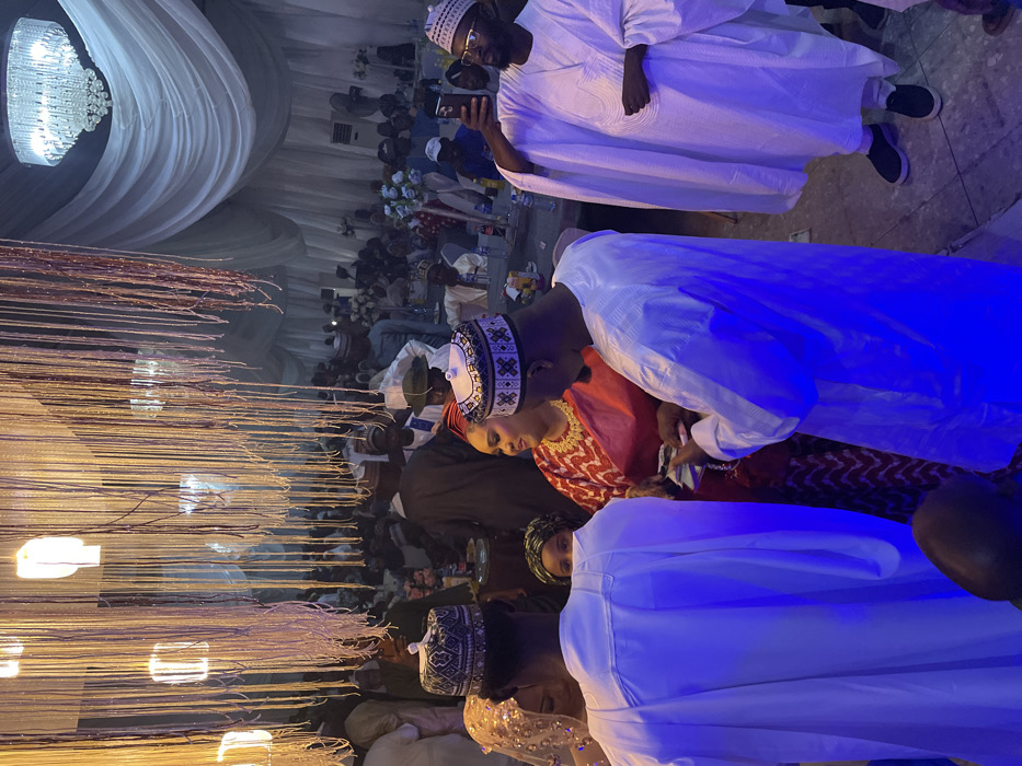 An indoor wedding celebration features attendees in traditional garments. Men wear white robes and embroidered caps, some using phones. A woman in a red and white patterned outfit is seated, attended by men in white. Decorative string lights hang from the ceiling near a large chandelier. The space is filled with seated guests.