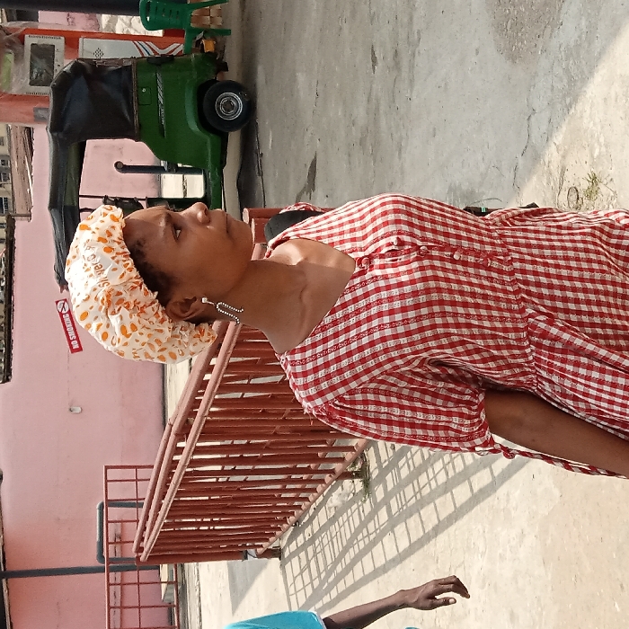 The image displays an outdoor scene in Ura Nta Umuarandu, Nigeria, illuminated by daylight. A young Black woman is prominently featured, positioned slightly right of center and captured in profile, facing to the right. She wears a red and white checkered v-neck dress with short, tie-detailed sleeves and a white shower cap adorned with orange patterns, bearing the word "Silvero". Her left ear displays a silver-colored, rectangular loop earring. To her immediate left, the left arm and hand of another individual, wearing a light blue garment, are partially visible. In the background, a red metal railing extends horizontally. Behind this railing, a light pink building wall features a red "NO SMOKING" sign with white text. To the far right, a green tricycle with a black canopy is parked next to a green plastic chair. A white and red structure, consistent with a fuel pump, is partially visible behind the tricycle. The ground is paved concrete or asphalt, exhibiting minor cracks and casting distinct shadows from direct sunlight.