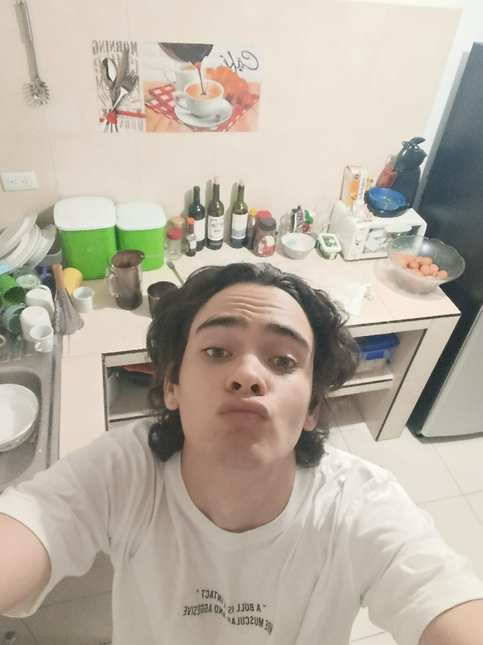 A young man with dark, wavy hair poses in a selfie, puckering his lips slightly. He wears a white t-shirt. The background is a cluttered kitchen counter with dishes, bottles, and kitchen supplies. A coffee-themed picture hangs on the wall behind the counter. A refrigerator is visible on the right side of the frame.