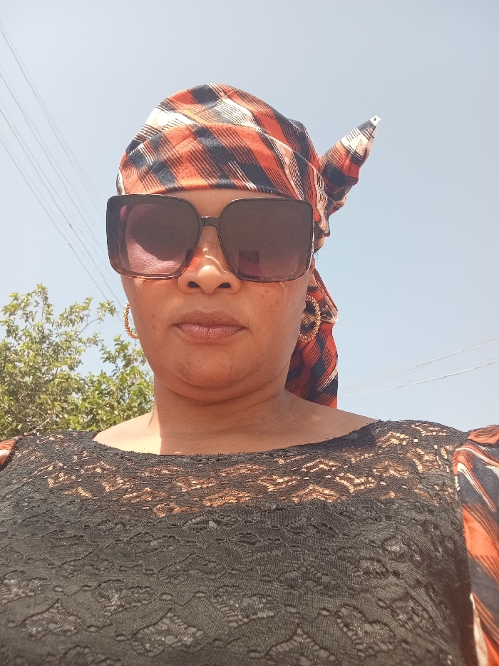 A close-up, chest-up image depicts an adult female outdoors in Narayi, Nigeria, under a clear, bright sky