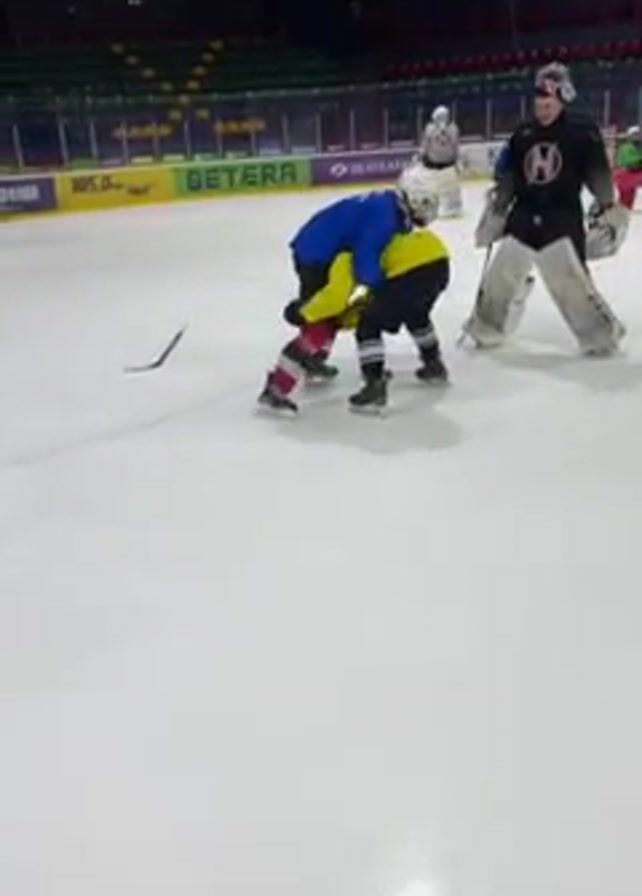 On an indoor ice hockey rink with a green and yellow seating area visible in the background, two hockey players are wrestling on the ice. One player is wearing a blue jersey with white lettering, while the other is wearing a yellow jersey. They are entangled in a physical struggle, eventually falling to the ice with the blue-jerseyed player on top. To the right of the wrestling players, a hockey goalie in black and white gear observes the scene, holding a goalie stick. Another hockey player in gray skates by in the background. There are advertisements and banners displayed around the rink's perimeter.