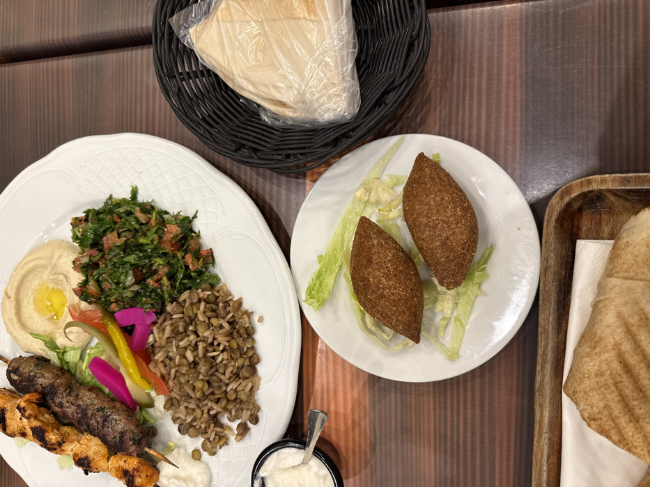 The image depicts a meal served on a wooden table within a restaurant setting in Brussels, Belgium. The central focus is a large white oval platter laden with a Middle Eastern or Levantine meal. This platter contains two grilled skewers: one with chicken cubes and the other with ground meat (kofta). Accompanying the skewers are a scoop of hummus topped with olive oil, a portion of tabbouleh salad, a bed of rice mixed with lentils, and an assortment of pickled vegetables in vibrant pink, yellow, and green. A small dollop of white sauce is visible near the chicken skewer. To the bottom left of the main platter, a small white bowl with a silver spoon holds another white dip, likely a yogurt-based sauce. Below this, a portion of a wooden serving tray with toasted flatbread or wraps on a white napkin is partially visible. A separate small white plate, positioned below and to the right of the main platter, holds two deep-fried, torpedo-shaped items identified as kibbeh, resting on a few leaves of shredded lettuce. In the upper right quadrant of the image, a dark woven basket contains several pieces of flatbread, individually wrapped in clear plastic film. The table surface is a reddish-brown wood with distinct horizontal grain patterns. No people are visible in the scene.