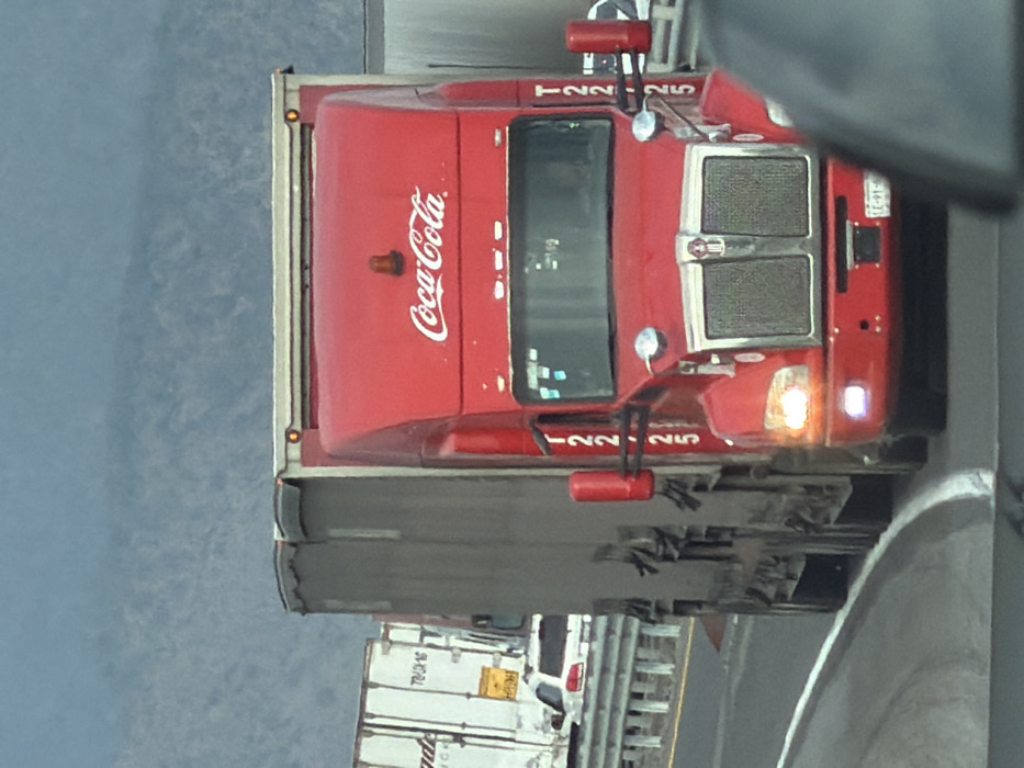 An overhead shot depicts a red Coca-Cola truck on a road. The cab bears the Coca-Cola logo and the number 122-25. The truck's grille is visible, as is its front side. Other vehicles are present in the distance. The surrounding landscape appears hazy, potentially suggesting a mountain setting.