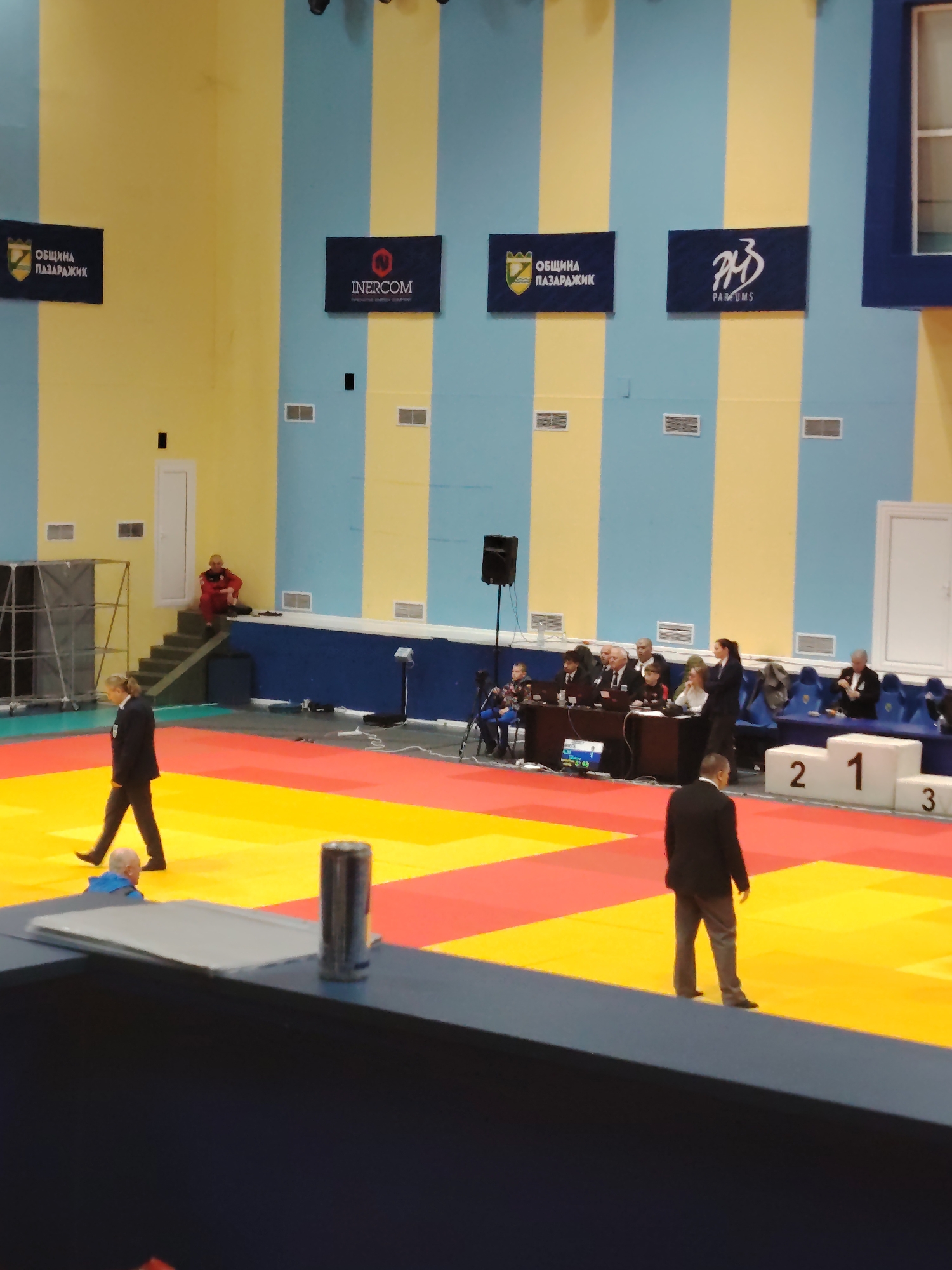 n indoor judo competition venue in Pazardzhik, Bulgaria. The venue has a judo mat in yellow and red colors. There are spectators on the sides of the mat. A podium with the numbers 1, 2, and 3 is on the side of the mat. People, likely referees or officials, are seated at a table. Banners with logos are hanging on the wall. Two men are walking across the mat.