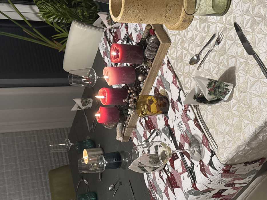 A festive table setting features an Advent wreath with four lit red candles and decorative elements