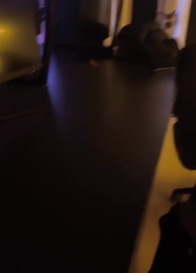 The camera pans from a desk surface to show a young man sitting in an office chair, legs crossed. He is wearing a beige sweatshirt, black pants, and a smartwatch. A jacket hangs off the back of the chair. He makes hand gestures and then rubs his face with his hands. Another person is sitting in front of him, facing away from the camera. The room is dimly lit, with a monitor and a neon light visible. There is a poster on the wall that says “ЗАБРОШЕНО ЧИСТУ”.