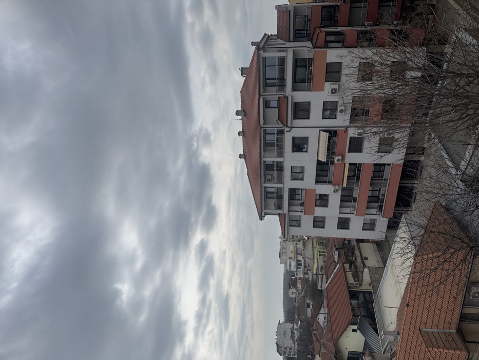 The image depicts an elevated view of a residential area in Ruse, Bulgaria, under an overcast sky