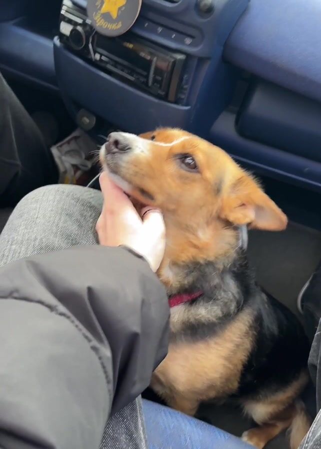 A medium shot shows a dog being petted in the passenger seat of a car. The dog is tan, black and white. It sits in the lap of someone wearing gray jeans. The person is wearing a black jacket and their hand is petting the dog's neck. The car has a blue interior. The radio is visible in the dashboard, and a yellow star-shaped decoration hangs above.