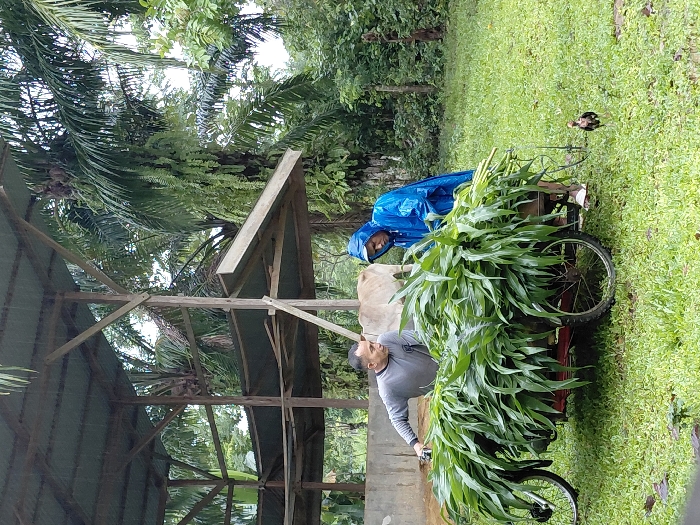 The scene is located in Keude Cunda, Indonesia, depicting an outdoor, rural environment during daylight under active rainfall. Two adult males are the primary human subjects. The man on the left, wearing a gray long-sleeved shirt, stands beside a two-wheeled cart heavily loaded with green leafy fodder. He has short dark hair and is looking towards the man on the right. The man on the right wears a bright blue hooded rain poncho and is positioned next to the cart, appearing to interact with or arrange its contents. The cart is an older model, possibly a bicycle attachment or handcart, with a red frame and metal-spoked wheels, completely overflowing with bundles of long, vibrant green plant material. In the background, a light-colored cow is partially visible behind a low, light-grey concrete barrier. To the left, a wooden structural frame, possibly part of a shelter or an unfinished building, with a corrugated metal roof, is present. Dense tropical vegetation, including tall palm trees and various ferns, forms the backdrop. A small, dark-feathered chicken or rooster stands on the short, green grassy ground in the lower right foreground. Visible streaks in the air confirm ongoing precipitation. The sky appears overcast.