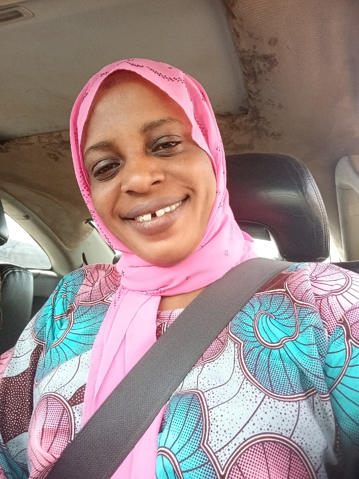 An adult female is depicted in a medium-shot, seated inside a vehicle. She has a medium-dark complexion and is smiling broadly, revealing a prominent gap between her two upper front teeth. She wears a light pink hijab with a subtle dotted pattern, covering her head. Her visible attire consists of a patterned garment featuring teal, pink, and white swirling and circular motifs, consistent with African wax print fabric. A dark grey seatbelt is diagonally secured across her left shoulder and chest. Behind her is a dark-colored car seat with a headrest. The vehicle's headliner, visible above her head, shows significant discoloration, dark stains, and signs of wear or deterioration. The specific location within the city of Sardauna, Nigeria, is not discernible from the visual evidence provided in the image.