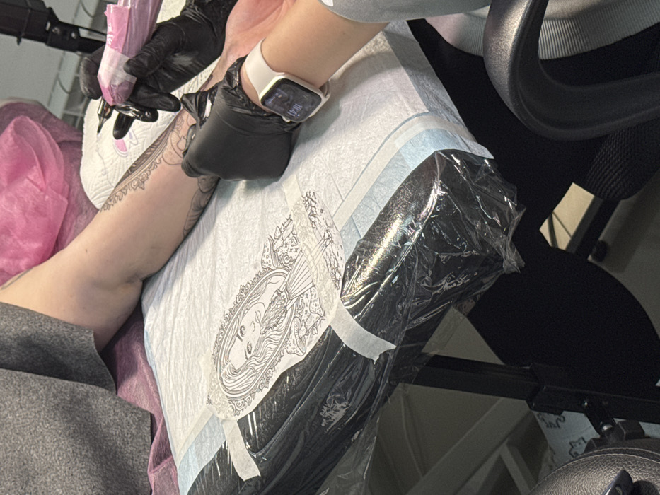 A gloved tattoo artist works on a client's arm. The arm rests on a table covered with a white and blue protective sheet. A transfer of the tattoo design, a woman's face in an ornate frame, is taped to the table. The artist wears an Apple watch and black gloves, holding a tattoo gun with pink accents. The background features a pink cushion, a gray garment, and part of a black chair.