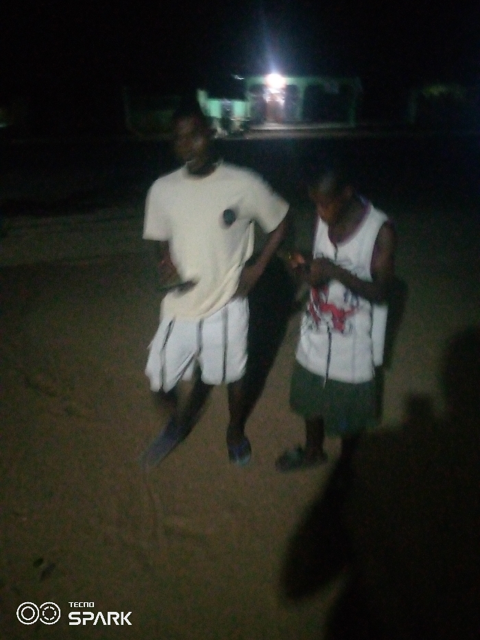 Two young men stand outside at night. The man on the left wears a white t-shirt, white shorts, and blue sandals. He holds something in his hand. The man on the right wears a white jersey with a red graphic and green shorts, and he looks at his phone. A dimly lit building is behind them. A shadow is visible in the foreground. The image has the TECNO SPARK watermark in the lower left corner.