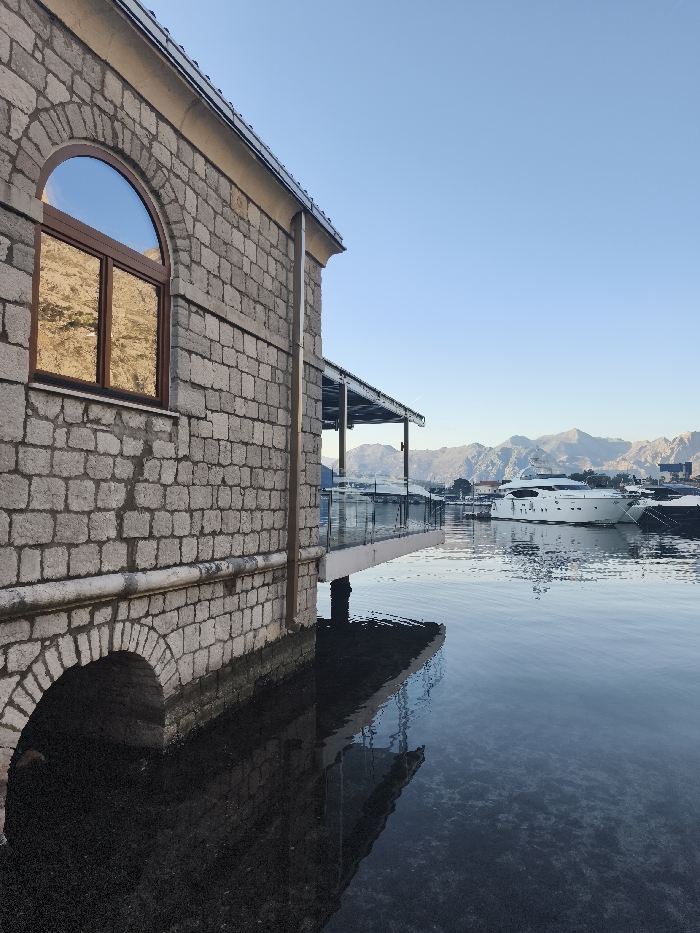 The image displays a waterfront scene in Kotor, Montenegro. On the left, a multi-story building constructed of light-grey rectangular stone blocks stands partially submerged in dark, calm water. An arched window with a dark brown frame on the upper floor reflects a golden-brown rocky mountain face. A horizontal light-colored stone band and a vertical downspout are visible on the building's exterior. At the base, a partially submerged arched opening is present. Attached to the stone building and extending over the water is an elevated modern terrace with a dark, slatted roof and clear glass railings. White tables and chairs are dimly visible beneath the roof. The terrace is supported by dark pilings extending into the water. The water reflects the structures darkly and shows visible clarity beneath the surface. In the mid-distance across the water, multiple white luxury yachts are moored. The background is dominated by rugged, light-colored mountains with visible rock formations and shadows, rising steeply under a clear, pale blue sky.