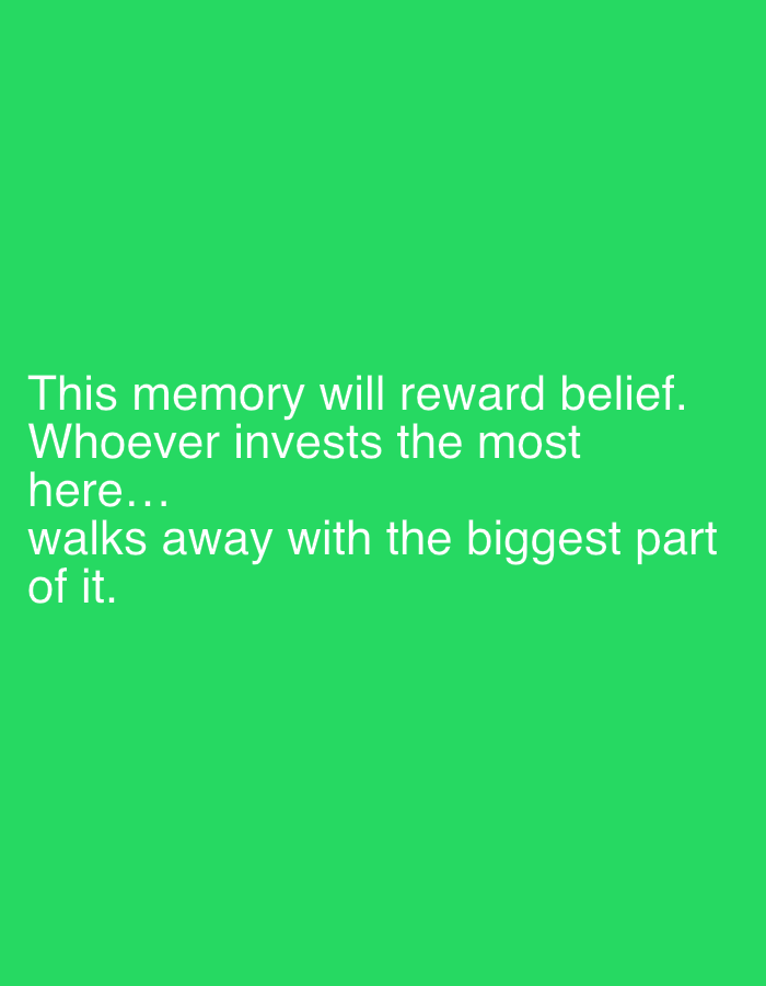 The scene is a digital graphic presenting a solid green background. White, sans-serif text is centrally aligned and reads: "This memory will reward belief. Whoever invests the most here... walks away with the biggest part of it." No people, specific objects beyond the text, actions, or additional environmental details are depicted within the graphic. This scene is located in Oreshak, Bulgaria.