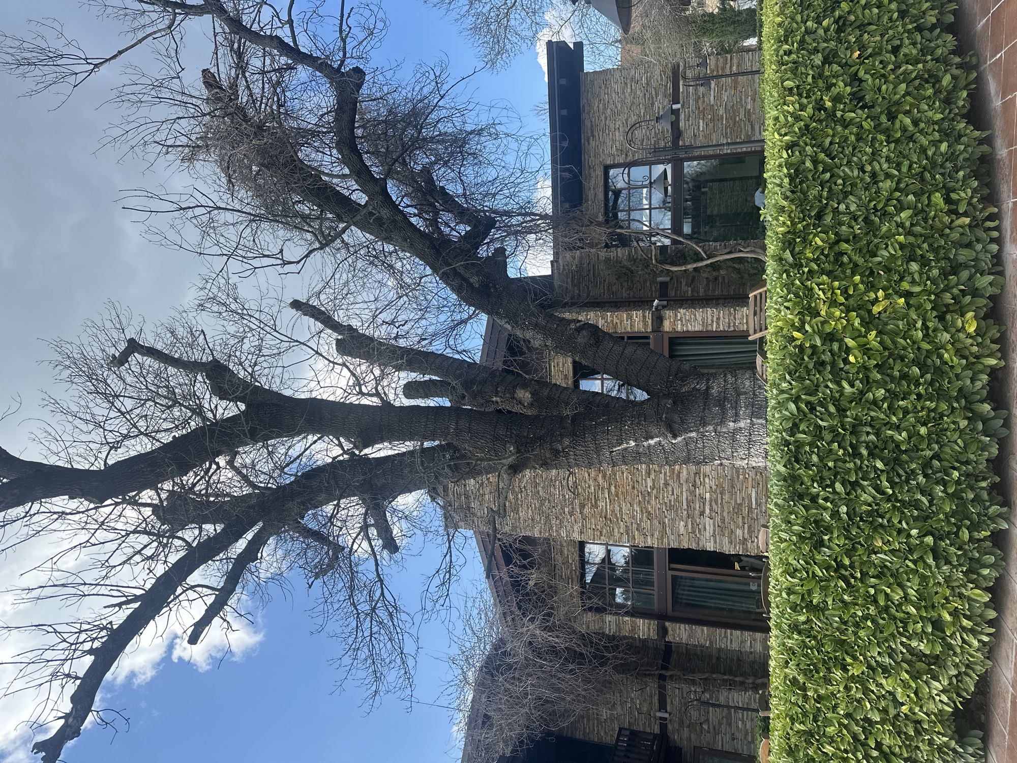The image presents a building facade in Svilengrad, Bulgaria, characterized by stone cladding and multi-paned windows with dark frames. A tall, leafless tree dominates the left side of the frame, its branches reaching towards a blue sky with scattered clouds. A dense green hedge lines the right side of the image. The overall perspective is looking upwards, with the building oriented vertically. There are no people visible in the image. The environment appears to be a residential or commercial area, judging by the architecture.