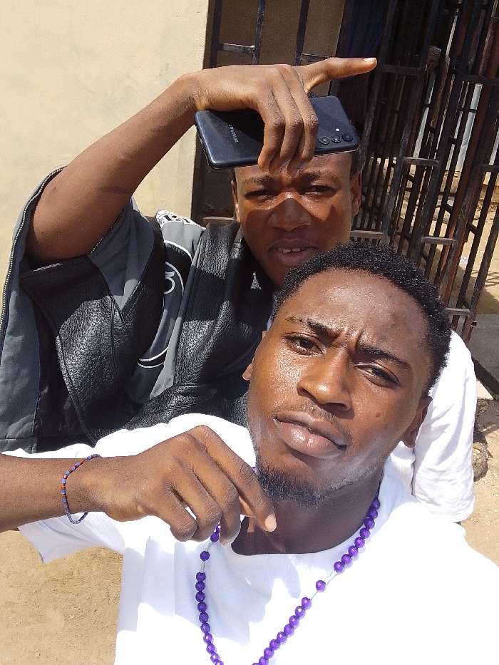 Two young adult males of dark skin tone are positioned in a close-up, outdoor setting