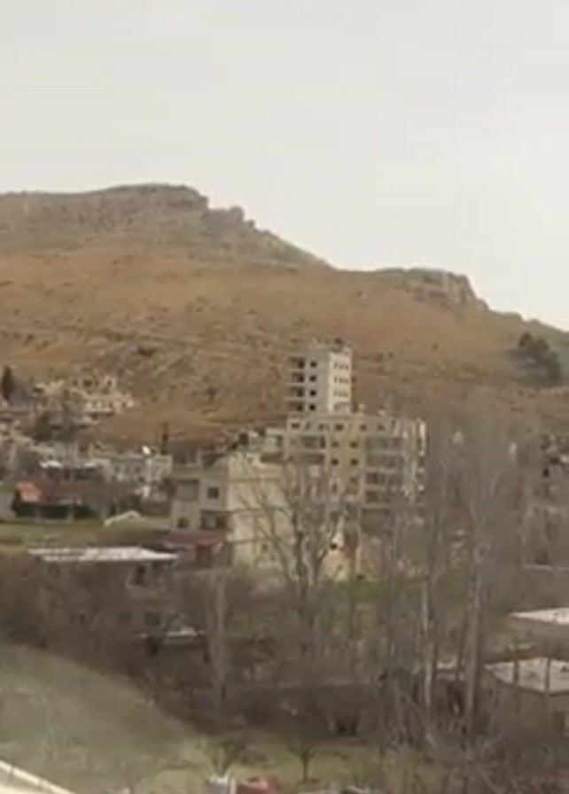 view from a window overlooking a small town nestled at the base of a rocky, sparsely vegetated hill. Buildings of various sizes, including a multi-story structure under construction, are scattered throughout the town. Bare trees stand in the foreground, and a red object is visible on a roof. The sky is overcast and pale.