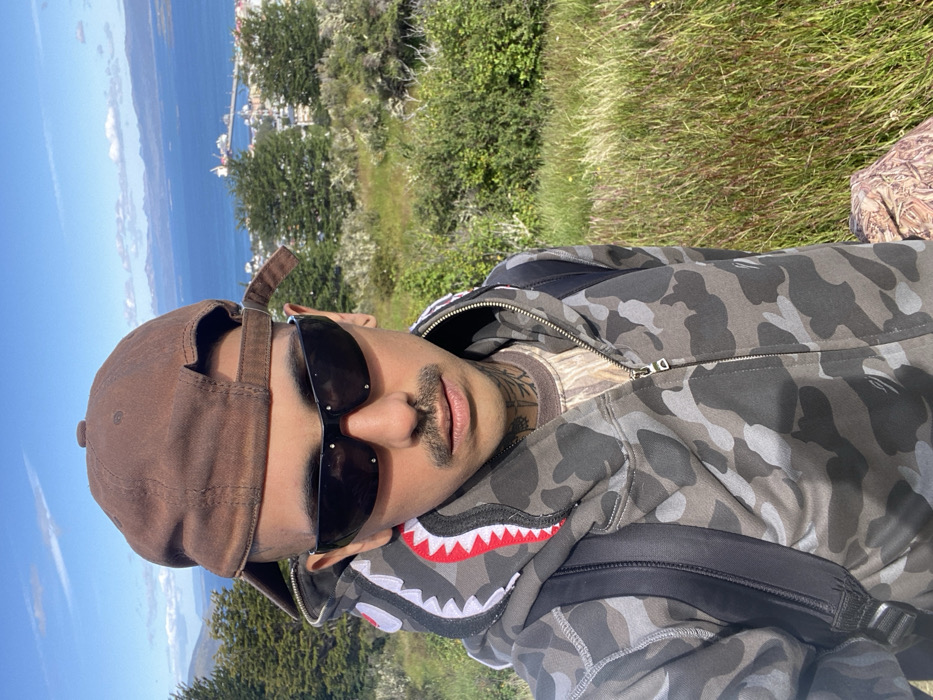 A man in a brown baseball cap and sunglasses poses outdoors. He wears a gray camouflage hoodie with a shark-like design around the hood. A black backpack strap is visible. A partial view of a city along a body of water is in the background, with surrounding green foliage and a clear blue sky. He has tattoos on his neck and a mustache.