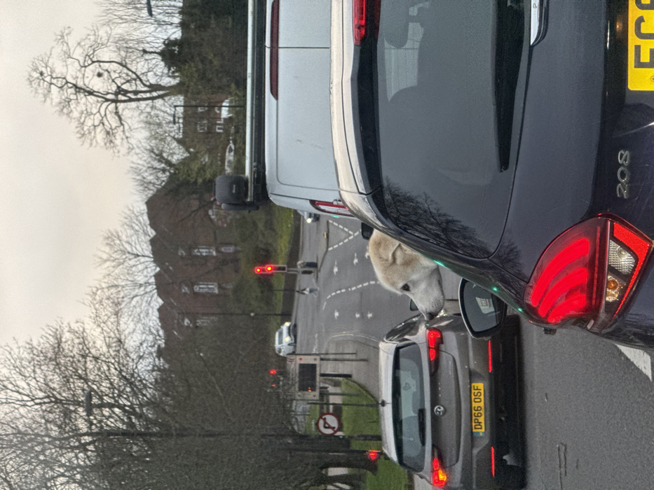 The image depicts an overcast daytime street scene on Portswood Road, Southampton, United Kingdom, looking northeast towards the junction with Lodge Road and Highfield Lane. Traffic is stationary at red lights. In the immediate foreground, the rear of a dark blue Peugeot 208 hatchback is visible, its red brake lights illuminated. A light-colored dog with short, cream-colored fur, pointed ears, and a long snout leans out of the Peugeot's partially lowered rear window, looking towards the left. Adjacent to the Peugeot on the left is a grey Vauxhall Astra hatchback, displaying the UK license plate `DP66 OSF`, also stopped with illuminated red brake lights. Ahead of the Peugeot, a white panel van equipped with a black roof rack and associated apparatus is stopped. Further down the road, which slopes slightly uphill, red traffic signals are visible, and a single pedestrian is observed midway across a marked crosswalk from right to left. On the left side of the road, a blue circular sign indicating a mandatory turn right at a roundabout is visible. The background features bare deciduous trees, behind which a large, multi-gabled, red brick building, identified as Highfield Hall, is prominently situated on higher ground. The sky is uniformly grey and overcast.