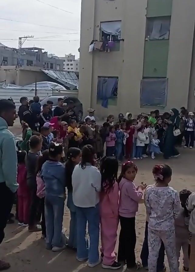 A wide-angle shot shows a group of children assembled in an outdoor area, likely a schoolyard, with a three-story building as a backdrop