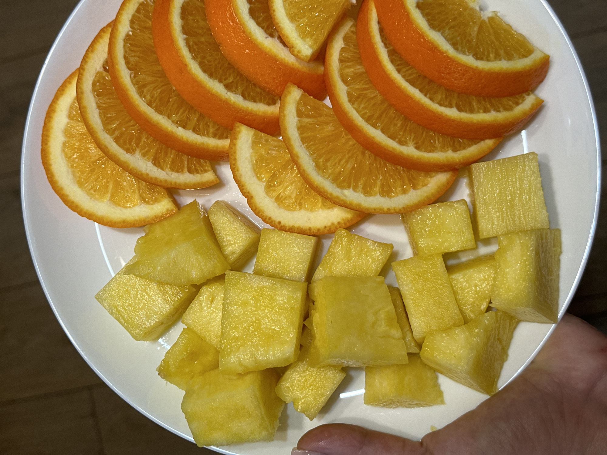 The scene is located in Novoalexandrovka, Russia. A white, circular plate is held by a human hand, visible on the lower-left. The plate contains a selection of cut fruit. On the left side, numerous irregular, roughly cuboid pieces of yellow pineapple are arranged. On the right side, multiple semi-circular slices of orange are fanned out in an overlapping pattern, displaying their bright orange flesh and white pith. The background is out of focus, appearing as a dark, indistinct surface.