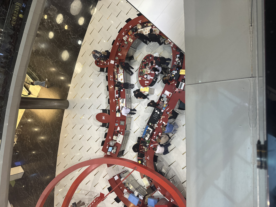 food court in the Atrium of the Evropeyskiy shopping mall, located at latitude 55.874, longitude 37.47 in Moskva, Russia. The view is from above, looking down on the food court with its red booths and tables, surrounded by white tiles and an escalator. Multiple people are seated at the booths, enjoying food. Some are standing, interacting with staff at the booths. One person is walking on an escalator in the background. The food court is brightly lit and clean, with the booths filled with patrons.